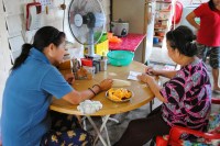 Later in the day Stephanie took us to see a special person. We visited Leong Ho Ming, the youngest sister of Kim’s mother. Auntie Ming lives on the banks of the river in Old Melaka where she has been more than forty years. It is a dilapidated area surrounded by new construction, including huge luxury hotels. The area is indicative of the nature of Old Melaka. A large number of buildings in disrepair, often vacant, and brand new construction, most seemingly directed to the tourism industry. And what do the tourists come to see? The ancient city of Melaka; the narrow streets are filled with tour buses. Seems a bit at cross purposes to me. Auntie Ming looked after Kim a great deal when she was young and there is a strong bond between them. This was very evident from the moment we walked into the house where she lives with her dependent 41 year old son, who has Down’s Syndrome.