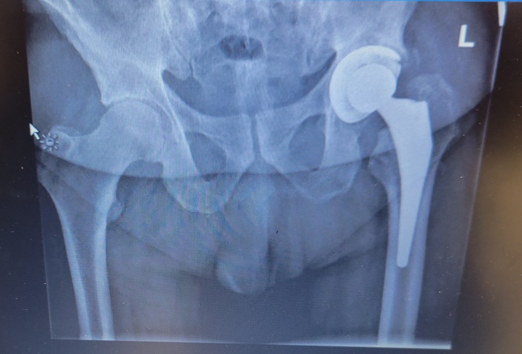 Thought I’d wrap up with an xray of my new hip. I thought it was pretty cool. The main part is titanium. Does that make me the Bionic Man?