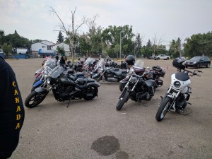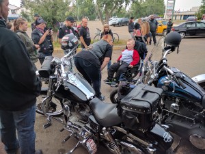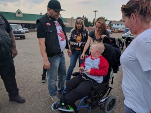 Jaxon had a wish to ride on a motorcycle. A chap by the name of Trevor learned of this and organized this mid-week ride. Overall there was about 60 bikes involved. A group of bikers came in from Camrose, including Tara with her trike. And that’s where Jaxon rode, like royalty almost, on her trike with his oxygen strapped on the back.